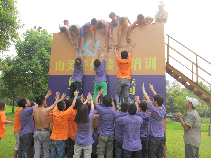 最后一個項(xiàng)目“畢業(yè)墻”,是由兩組團(tuán)隊(duì)共同完成的任務(wù), 期間,團(tuán)隊(duì)中很多閃光點(diǎn)在這個項(xiàng)目中都體現(xiàn)得淋漓盡致。為了能讓隊(duì)員登上畢業(yè)墻而被踩在腳下的“人梯”,不遺余力把每名隊(duì)員拉上畢業(yè)墻的“拉手”,在后面做著安全保護(hù)的“后盾”……除這既定的這些角色,團(tuán)隊(duì)的每一名伙伴都在主動承擔(dān)著責(zé)任,上去的隊(duì)員看到“拉手”拉不動而主動伸出的雙手;為了不讓“人梯”太累,下面等待的隊(duì)員有的高舉雙手做著保護(hù),有的也貢獻(xiàn)著自己的肩膀讓隊(duì)友踩在腳下;甚至有的隊(duì)友沒有踩對正確的位置,而把被踩人的肩膀都踩掉皮了,但被踩者沒有一句怨言;有的隊(duì)友甚至用自己的腿和手臂當(dāng)起了梯子……為了隊(duì)友的安全,為了團(tuán)隊(duì)的目標(biāo),世紀(jì)陽天的男女同事不分彼此奉獻(xiàn)著自己的力量和智慧……現(xiàn)場的一起,讓每位參訓(xùn)人員都為之感動,而在這一刻的感動更是我們平常工作中所看不到的,原來我們是如此的團(tuán)結(jié)一心!