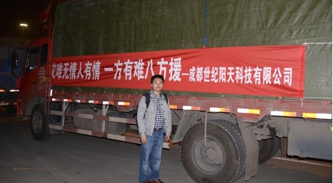 災(zāi)難無情人有情,2013年4月23日在成都世紀(jì)陽天科技有限公司救災(zāi)物資及人員在總經(jīng)理肖開強(qiáng)的帶領(lǐng)下于晚上20:00踏上了通往災(zāi)區(qū)的征程,此行目的地是重災(zāi)區(qū)天全縣。